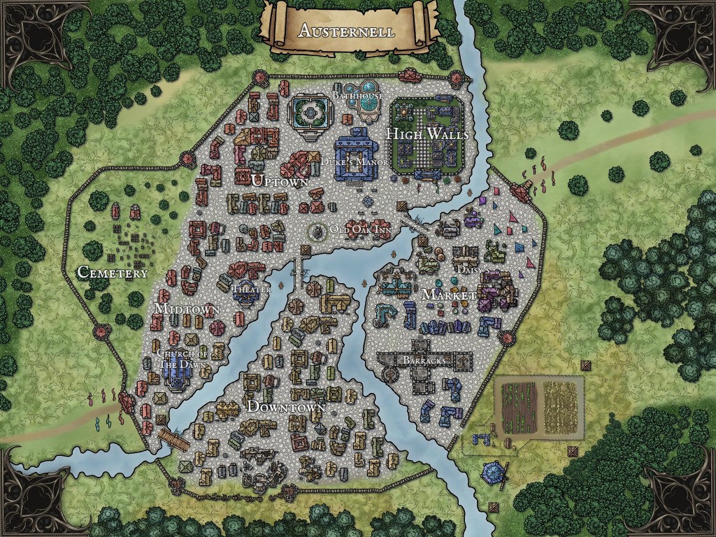 In the 1400s, Austernell flourished under the protection of Ayrengard and cooperation with Illi Ahn. Roads and highways were built to connect the city with Cerr Nyel and De Norilan. Now, the mining industry of Austernell supported the development of the League of Allied Cities. As commerce increased, so did the wealthy upper class who orchestrated and managed trade between the cities of the League. The wealthy citizens established the thriving urban districts of Uptown and Midtown north of the river. In 1438, the theater was constructed with donations from wealthy investors. In 1455, the High Walls neighborhood was built. The southern Downtown district became largely comprised of the poorer working class that worked the mines and the farms. In 1479, the Church of the Dawn was built by the citizens of Austernell as a means for the city to care for its sick and poor.